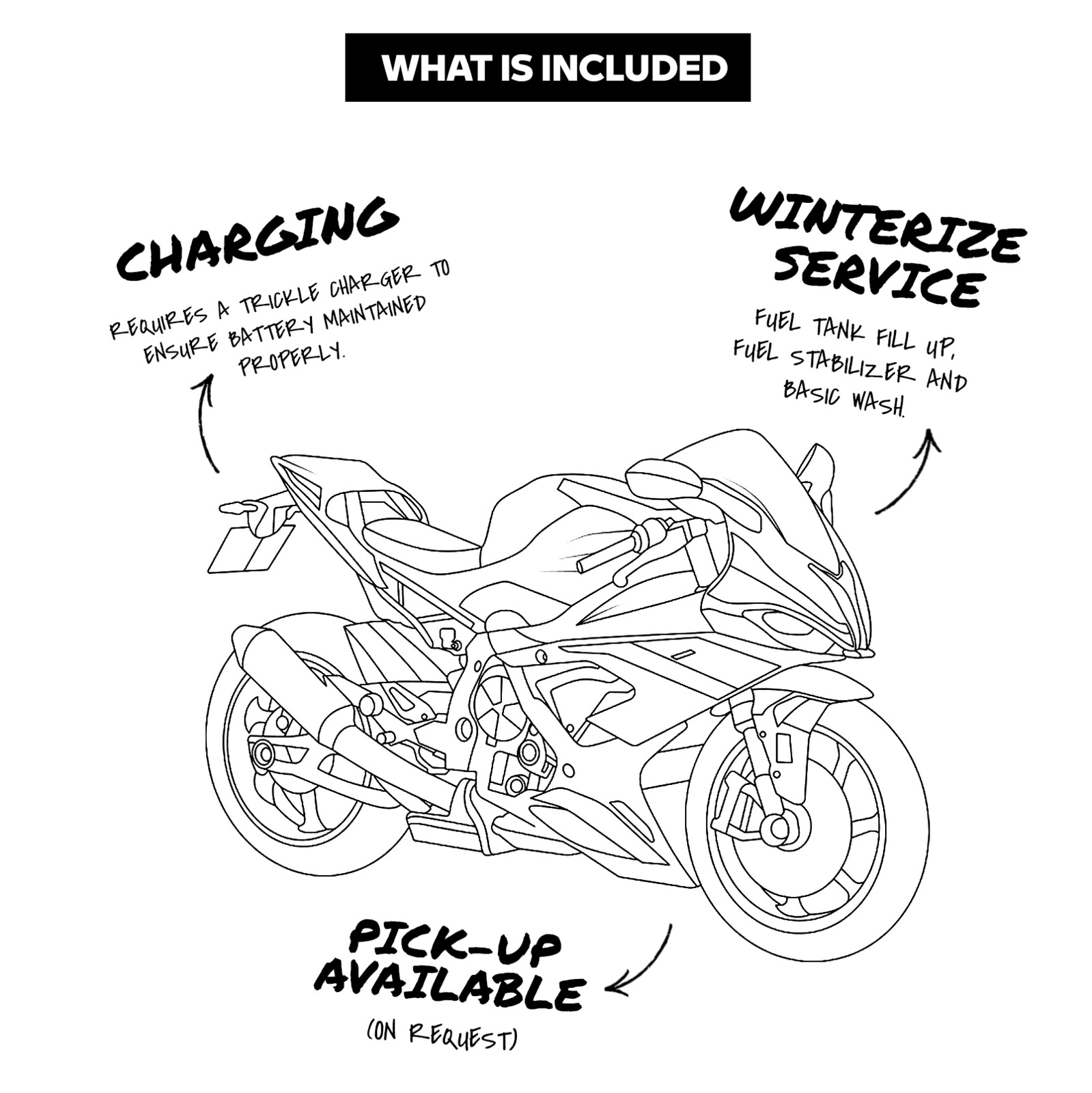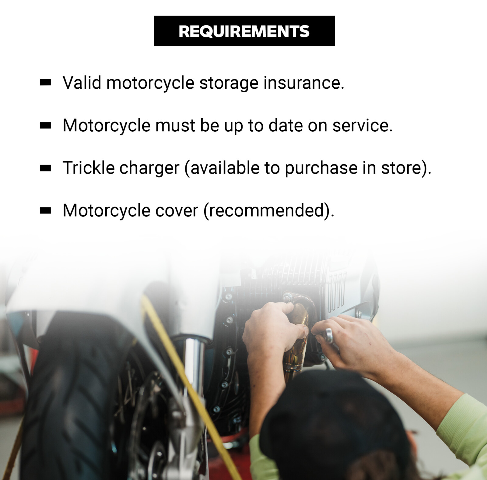 All machines are stored at High Road Langley in an alarmed and climate controlled environment which keeps your motorcycle out of the weather and safe until you are ready to ride again in the spring.