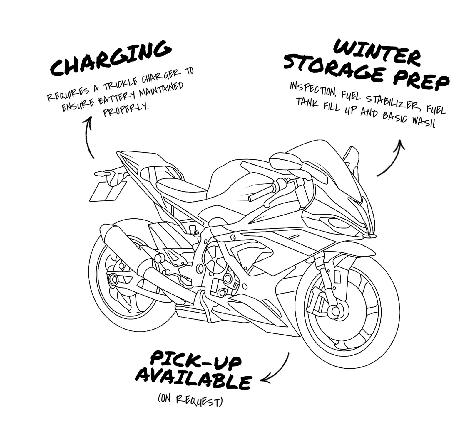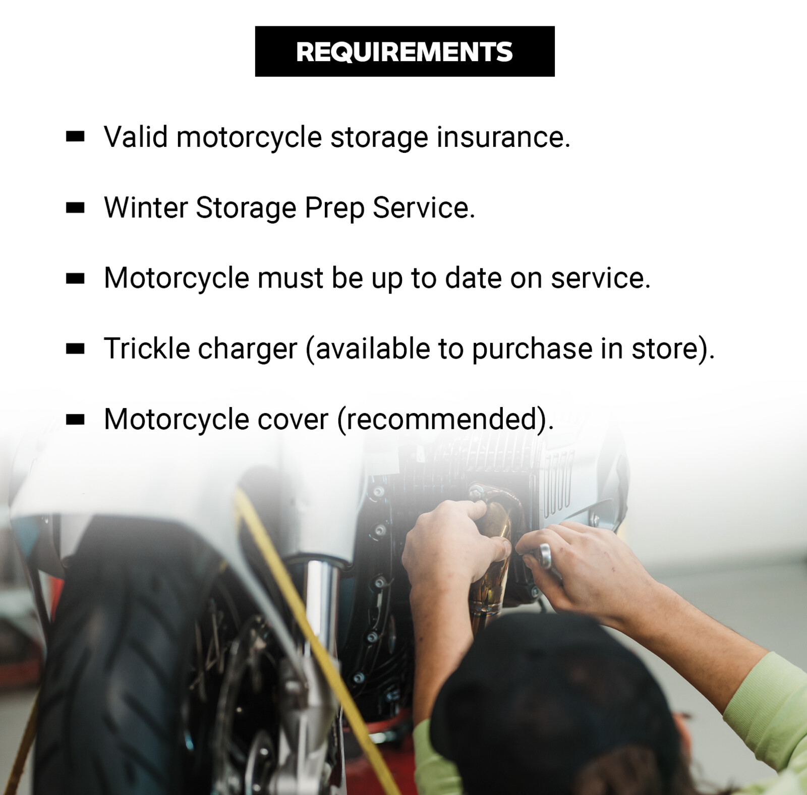 All machines are stored at High Road Langley in an alarmed and climate controlled environment which keeps your motorcycle out of the weather and safe until you are ready to ride again in the spring.